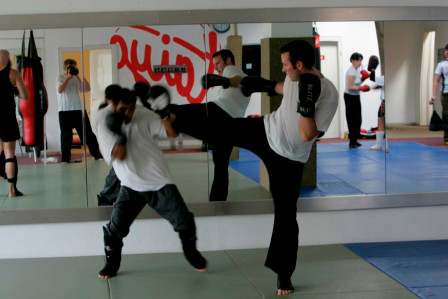 Das Element Thai-Kickboxen beim Soshin-Do ist die sportliche Version der Kampfkunst (s.o.). Hier kann man ordentlich schwitzen und sich austoben. Technik, Kondition, Dehnung und Schnelligkeit werden hier trainiert, beim direkten Kontakt wird mit Hand- und Fußschützern geübt. Übrigens, für Insider: der Einsatz von Knie und Ellenbogen wird auch unterrichtet! Zur Beruhigung für die älteren Semester: Sie müssen nicht zum Kopf treten, um effektiv kämpfen zu können!